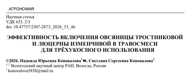 В журнале Пермский аграрный вестник №1 (53) за 2026 опубликована статья «Эффективность включения овсяницы тростниковой и люцерны изменчивой в травосмеси для трёхукосного использования». Авторами статьи являются старший научный сотрудник Коновалова Н.Ю., лаборант-исследователь Коновалова С.С.