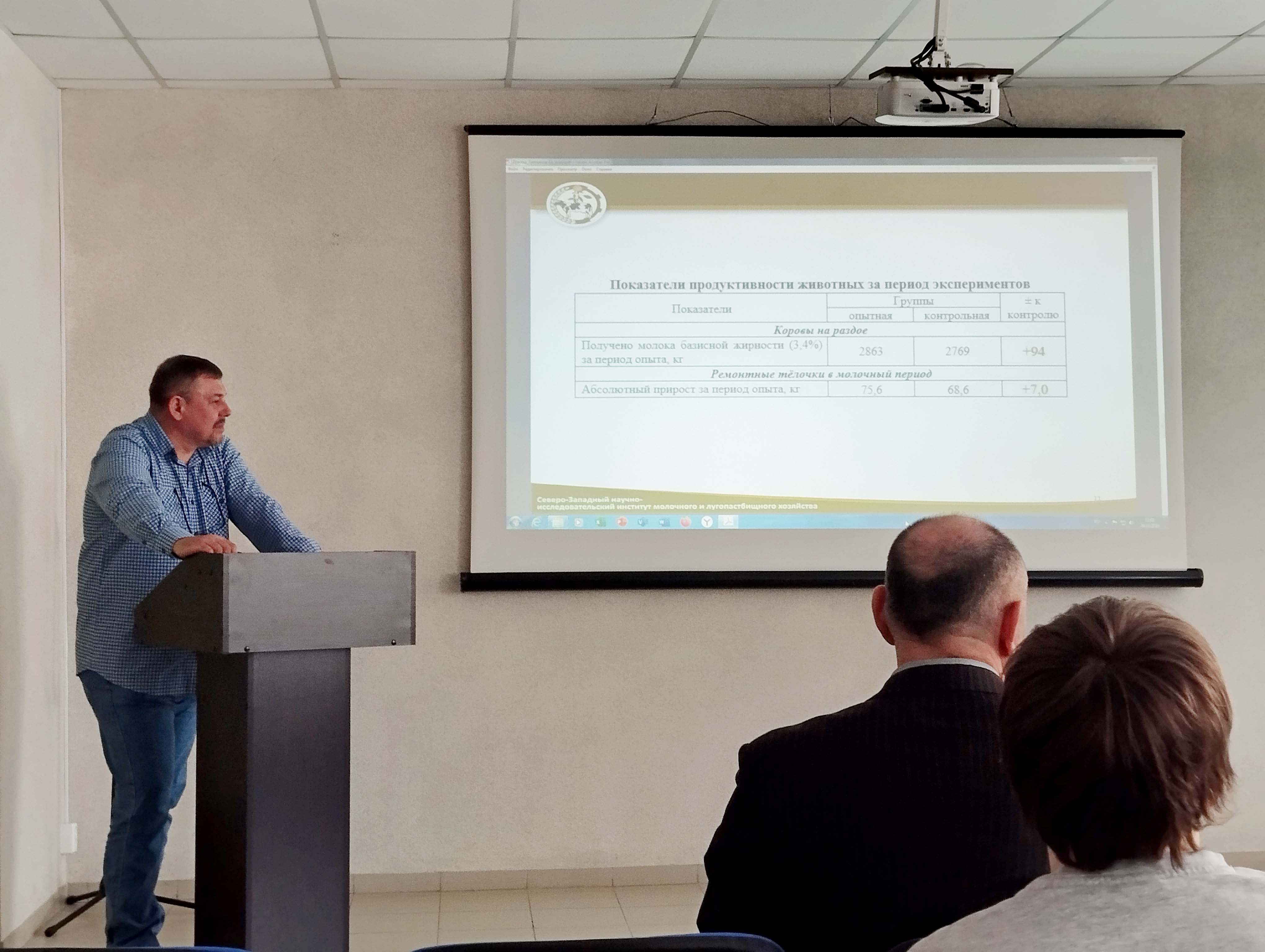 24 марта 2026 года в СЗНИИМЛПХ – обособленном подразделении ФГБУН ВолНЦ РАН под руководством учёного секретаря к.с.-х.н. В.В. Вахрушевой состоялся научный семинар-дискуссия «Этологические проявления крупного рогатого скота при включении в рационы кормовых добавок». С докладом выступил ведущий научный сотрудник технологического отдела к.с.-х.н. доцент Е.А Третьяков.