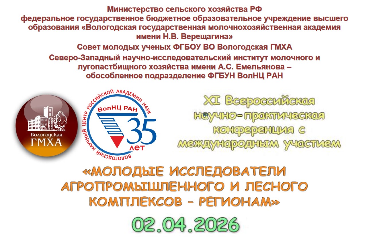 2 апреля 2026 года в Вологодской ГМХА состоялась XI Всероссийская научно-практическая конференция «Молодые исследователи агропромышленного и лесного комплекса - регионам» и объединила студентов и молодых ученых из 16 регионов Российской Федерации, а также Республик Беларусь и Казахстан. География российских участников включила Вологодскую, Псковскую, Калининградскую, Ленинградскую, Московскую, Свердловскую, Воронежскую, Костромскую, Орловскую, Ярославскую, Челябинскую, Архангельскую, Пензенскую области, Республики Татарстан, Кабардино-Балкария и Красноярский край. Всего было представлено 351 доклад по номинациям «Экономика», «Агрономия и садоводство», «Зоотехния», «Ветеринария», «Лесное дело», «Агроинженерия» и «Продукты питания животного происхождения».