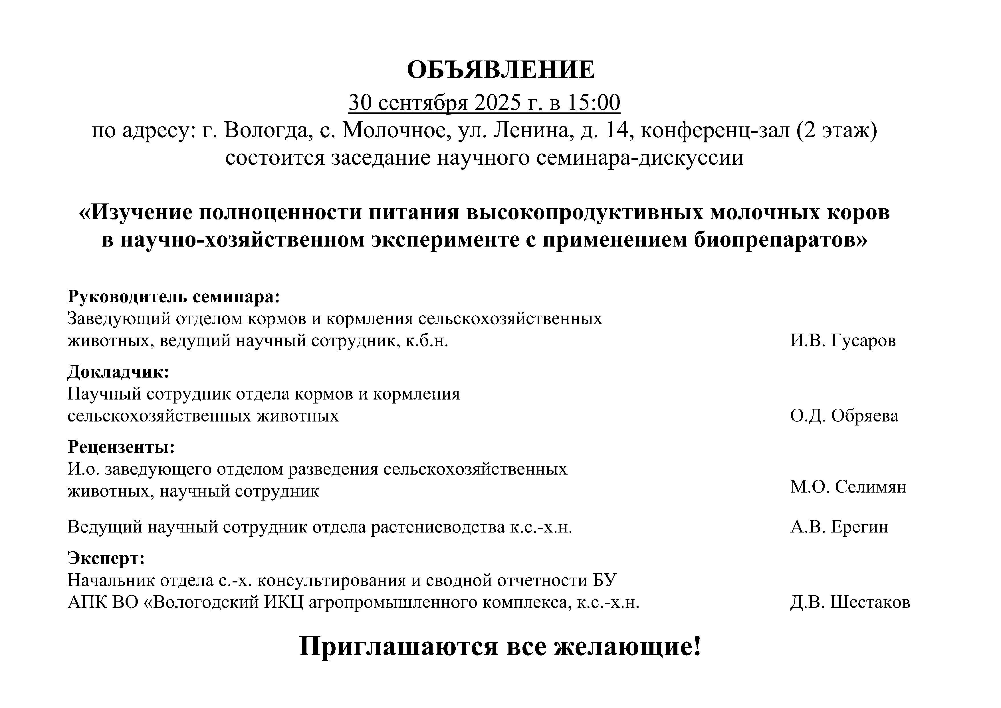 ​30 сентября 2025 г. состоится заседание научного семинара-дискуссии «Изучение полноценности питания высокопродуктивных молочных коров в научно-хозяйственном эксперименте с применением биопрепаратов»