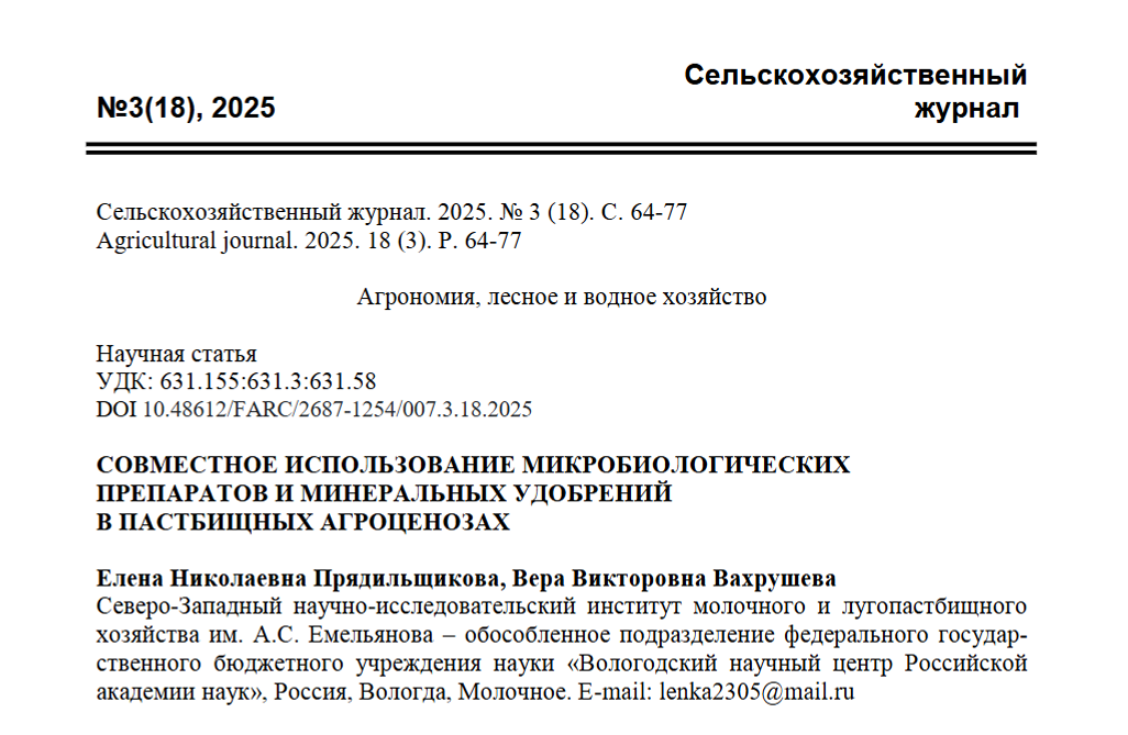 При создании травостоев для пастбищного использования применялись культуры и сорта, включенные в Государственный реестр селекционных достижений и разрешенные к использованию, фестулолиум Аллегро, тимофеевка луговая Ленинградская 204, овсяница луговая Свердловская 37, мятлик луговой Балин, клевер белый Мерлин. В ходе исследования применялись минеральные удобрения и микробиологические препараты Бисолби-Т и Экстрасол, обработку которыми проводили по рекомендациям производителей.Передпосевомвносилисьминеральныеудобрениявстартовойдозе N45P60K90, со второго года жизни –N90P60K90, N120P60K90, N150P60K90. Употребление микробиологических препаратов в порошкообразной и жидкой формах оказывало положительное влияние на показатели продуктивности и питательности многолетних трав пастбищного использования в условиях Вологодской области. При сочетании минеральных удобрений с препаратом Бисолби-Т урожайность пастбищных травостоев увеличивалась, по сравнению с контролем, до 19 %, а при использовании Экстрасола – до 14 %.
