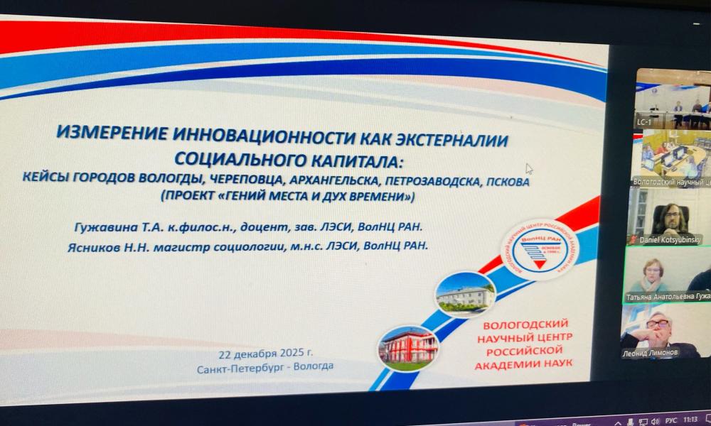 Центральным событием семинара стал доклад сотрудников Лаборатории экономико-социологических исследований ВолНЦ РАН (г. Череповец) в.н.с. к.филос.н. Татьяны Анатольевны Гужавиной и м.н.с. Николая Николаевича Ясникова на тему: «Измерение инновационности как экстерналии социального капитала: кейсы городов Вологды, Череповца, Архангельска, Петрозаводска, Пскова». Ученые представили результаты полевых исследований и анализ данных, наглядно продемонстрировав, как социальный капитал и культурный контекст влияют на формирование инновационных установок в городских сообществах.