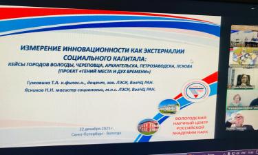 После презентации развернулась оживленная и продуктивная дискуссия. Участники семинара обсудили актуальные вопросы социальной и культурной динамики городов. По итогам обмена мнениями были намечены перспективные направления для дальнейшей совместной работы, включая создание детальных профилей городов Северо-Западного федерального округа с акцентом на инновационный потенциал местного населения и готовность к принятию новых технологий. В рамках реализации этих направлений приняты организационные решения, закрепляющие научное сотрудничество. Во-первых, запланировано подготовка и издание тематической монографии, которая обобщит теоретические подходы и полученные эмпирические данные. Во-вторых, для презентации промежуточных итогов и интеграции в широкий академический дискурс ученые ВолНЦ РАН примут активное участие в Ежегодной конференции из цикла «Леонтьевские чтения» в 2026 году. Участие в конференции предусматривает как выступление с докладами, так и экспертное обсуждение полученных данных в рамках одной из ключевых российских научных площадок по проблемам социально-экономического развития.