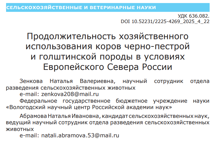 В рамках научно-исследовательской работы сотрудниками отдела разведения сельскохозяйственных животных СЗНИИМЛПХ изучена динамика продуктивного долголетия и воспроизводительной способности коров молочных пород на Европейском Севере РФ. Определено превосходство животных чёрно-пёстрой породы по показателям возраста в отелах и возраста выбытия над голштинской породой на Европейском Севере РФ.