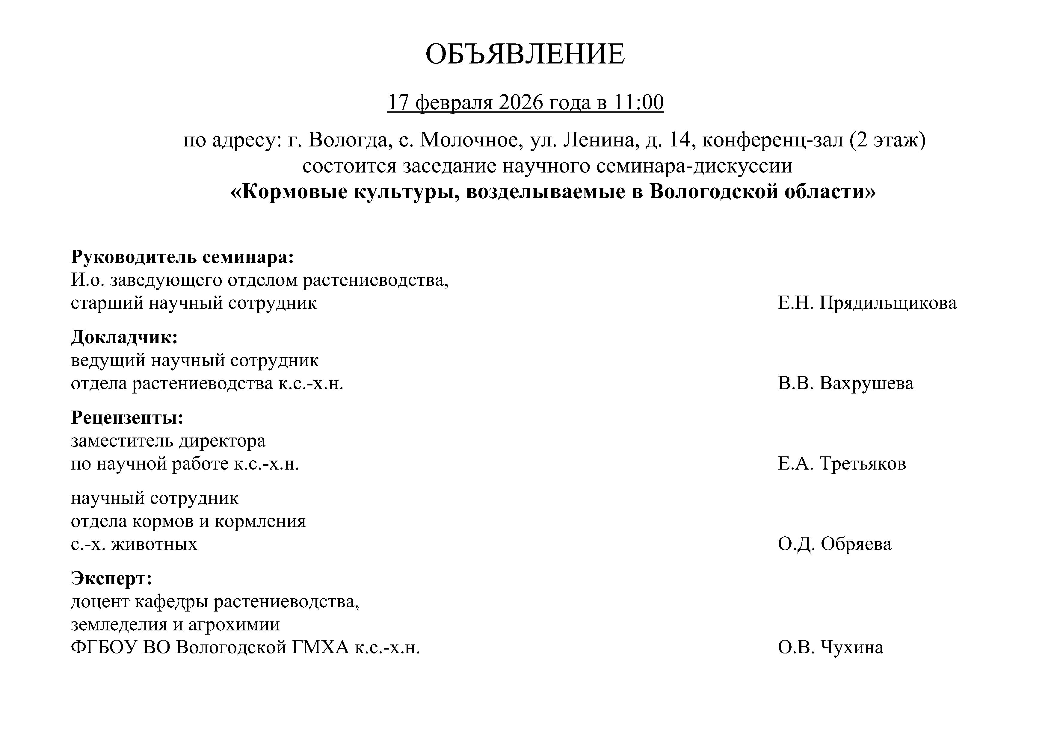 ​17 февраля 2026 года состоится заседание научного семинара-дискуссии «Кормовые культуры, возделываемые в Вологодской области»