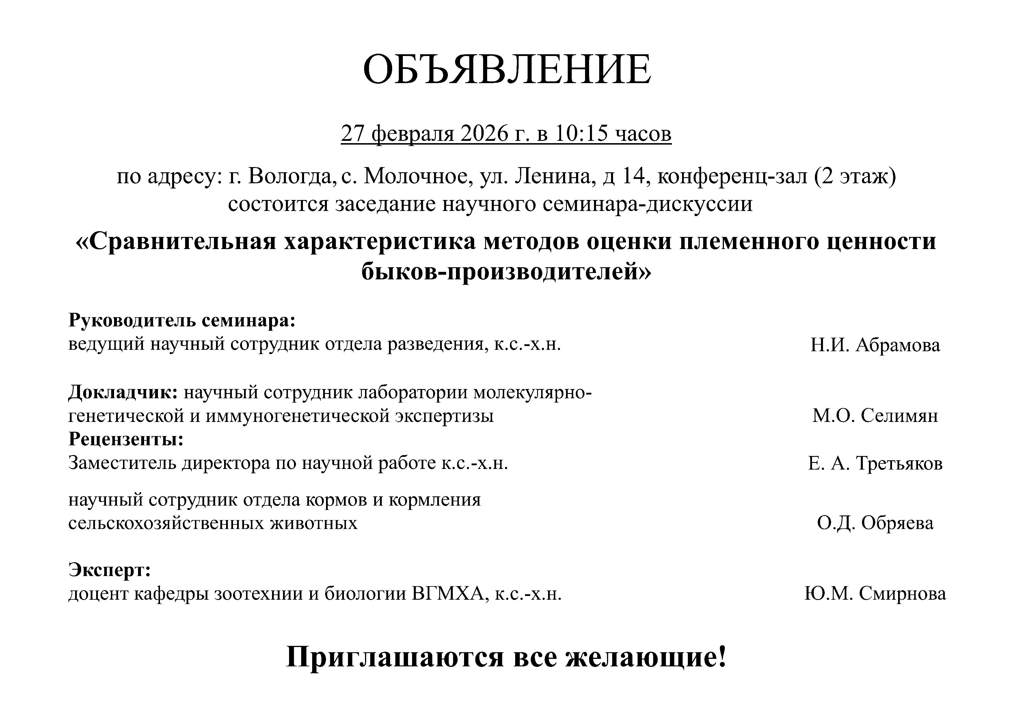 27 февраля 2026 г. состоится заседание научного семинара-дискуссии «Сравнительная характеристика методов оценки племенного ценности быков-производителей»
