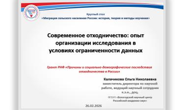 Вологодский научный центр РАН представила заместитель директора по научной работе ВолНЦ РАН, в.н.с. к.э.н., доцент Ольга Николаевна Калачикова. Ее доклад был посвящен исследованию современного отходничества в условиях ограниченности данных, реализованному при поддержке РНФ (проект № 23-28-01395 «Причины и социально-демографические последствия отходничества в России»).
