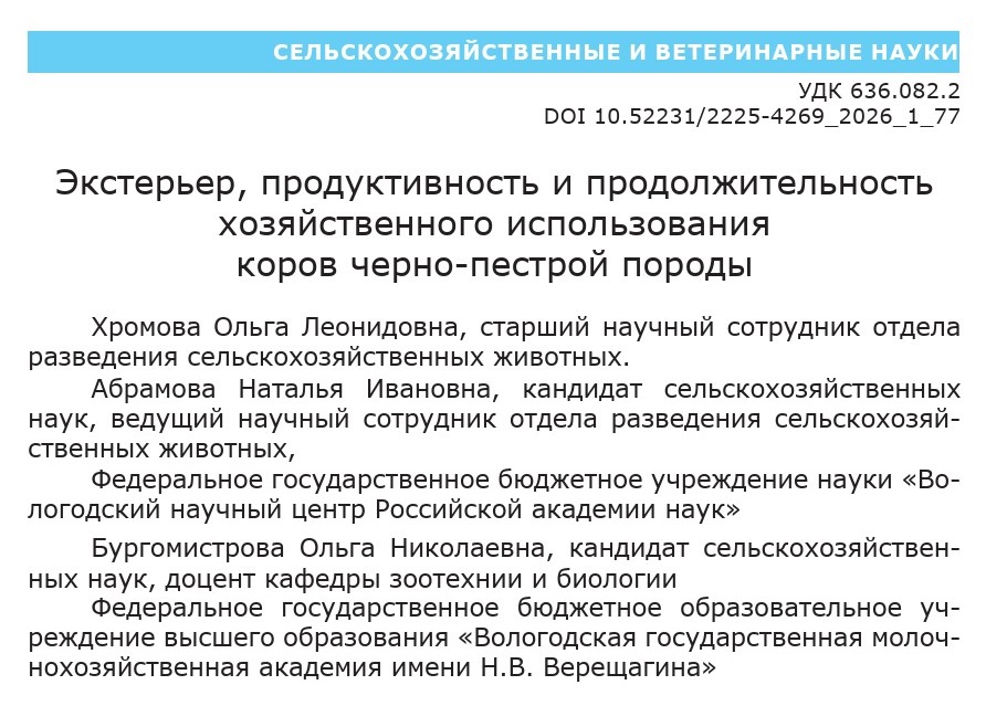 По результатам исследования установлено, что животные с более высокими оценками за стати экстерьера имеют превосходство по показателям продуктивности и продолжительности использования. Корреляционный анализ выявил признаки экстерьера положительно и достоверно (P≤0,01-0,001) влияющие на молочную продуктивность и пожизненный удой коров. Результаты исследования свидетельствуют о том, что отбор коров желательного типа телосложения в популяции черно-пестрой породы позволит улучшить экстерьерные признаки, увеличить продуктивность стада и продолжительность использования животных. DOI 10.52231/2225-4269_2026_1_77